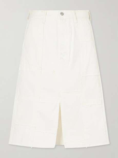 B Sides' 'Madras' skirt is reimagined from vintage denim through a hand-blanketing technique. Each piece is one of a kind, defined by its unique fade, patchwork construction and distressed edges that highlight its individuality.