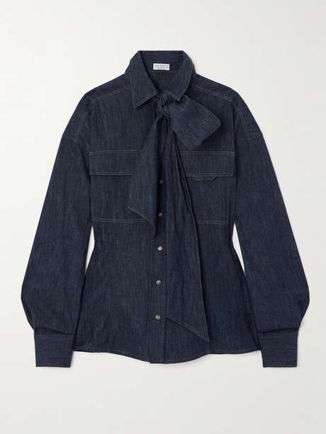 BRUNELLO CUCINELLI Bead-embellished pussy-bow denim shirt