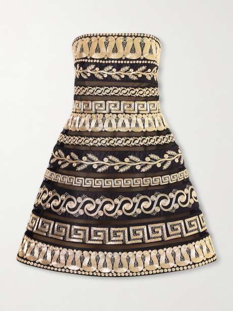 The meander motifs on Carolina Herrera's mini dress evoke the lush landscapes of Ancient Greece and the timeless tales of mythological heroes. Crafted from lightweight silk-organza, it features gold threads tracing striped bands of silk-satin. Style it with gold jewelry to complement the intricate embroidery.