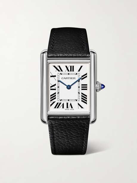 Debuted in 1917, Cartier's 'Tank' collection is inspired by the sleek lines and caterpillar tracks of the namesake military vehicle. This 'Must de Cartier' watch is made from stainless steel and accented with a crystal cabochon to match the blued steel sword-shaped hands, which are framed by classic Roman numerals. It rests on a leather strap that will age beautifully over time.