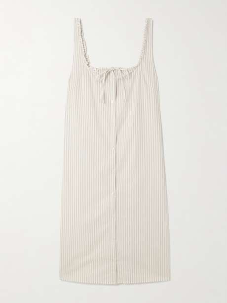 Deiji Studios' contemporary collections always have a sense of ease. This dress is made from mid-weight organic cotton-poplin patterned with neat stripes and trimmed with ruffles along the neckline and straps. Wear yours with ballet flats.