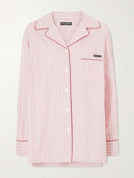 Dolce&Gabbana’s Spring Summer ’26 collection reworks sleepwear silhouettes through the house’s refined lens. Cut for a relaxed fit, it’s crafted from crisp cotton and silk-blend poplin patterned with classic stripes, with tonal piping tracing the edges.