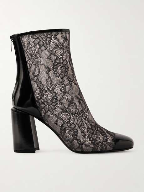 Jimmy Choo's 'Kisu' ankle boots are paneled with delicate lace for a hint of gothic romance. Trimmed with patent-leather, they have elegant round toes and rest on 85mm block heels.
