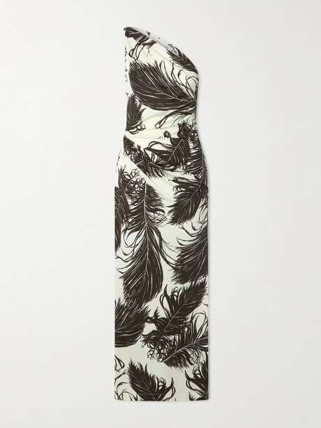 Oscar de la Renta's 'Milano' gown balances impact and elegance. Cut from slinky jersey, it’s printed with sweeping feather motifs and shaped to a one-shoulder silhouette that gently gathers at the waist.