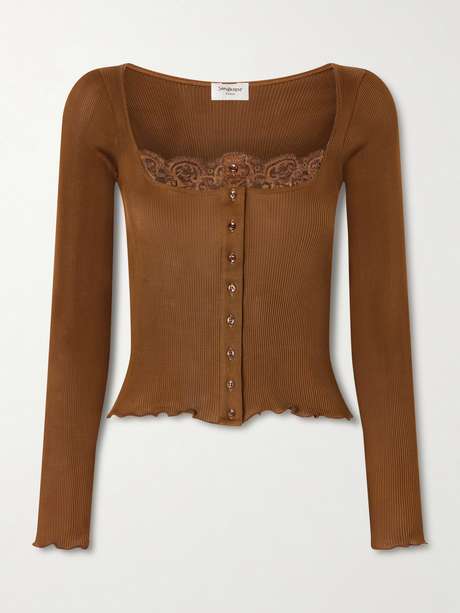 SAINT LAURENT Lace-trimmed ribbed silk-jersey cardigan