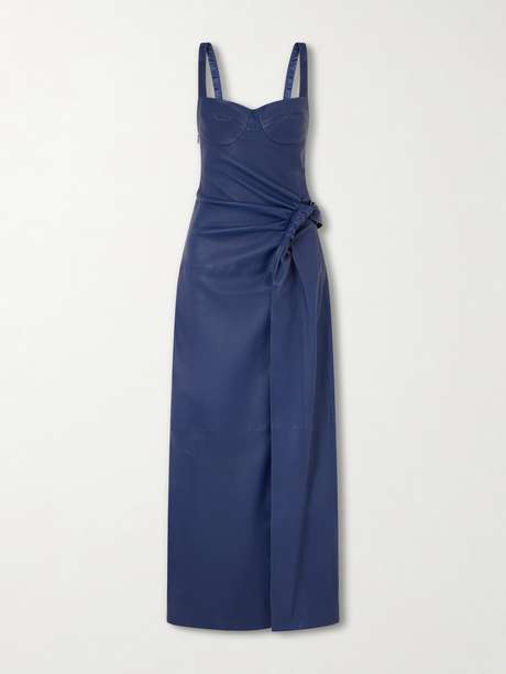 Simkhai’s 'Lyle' dress from the Spring ’26 collection is crafted from supple leather, featuring a fitted bodice with a scoop neckline and visible cups. Gathered detailing at the hip forms soft drapes that cascade into a flowing skirt with a dramatic deep slit. Pair it with high heels and statement jewelry for a striking look at special occasions.