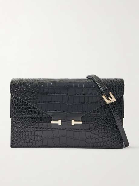 TOM FORD’s mini bag is crafted from croc-effect patent leather for a glossy, high-impact finish. The compact crossbody design keeps essentials close while making a bold statement — ideal for carrying a phone, cardholder and keys.