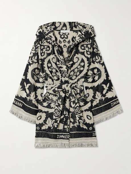 Zimmermann's robe is made from absorbent cotton-terry that's jacquard-woven with flowers and ornate swirls in a monochrome palette. It has soft fringing along the cuffs of the wide sleeves and hem and comes with a detachable belt.