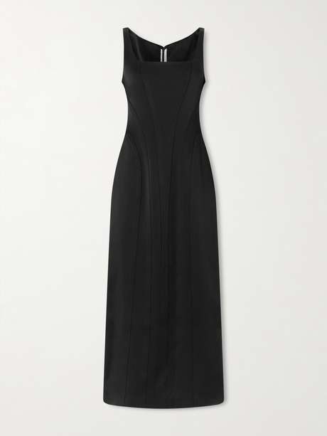 Another Tomorrow's aptly named 'Contour' dress is paneled to skim and shape your figure. It's made from black satin and has an elegant square neckline. Keep styling elevated with tonal accessories.