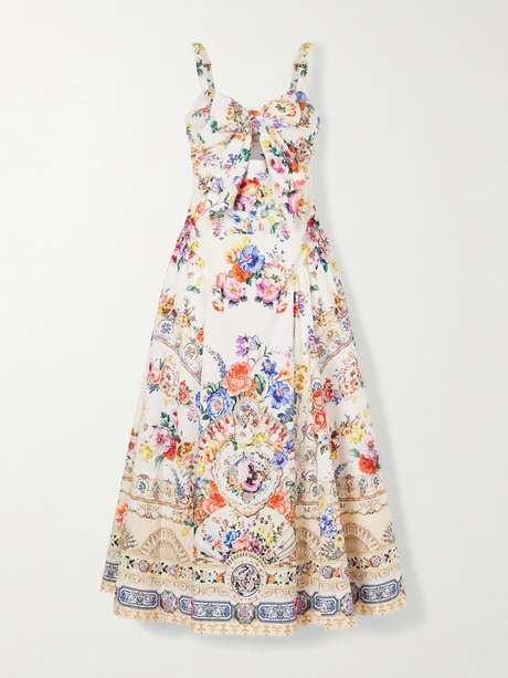 CAMILLA Ballerina tie-detailed cutout ruched floral-print cotton-blend midi dress