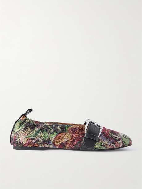 Inspired by tapestries, GANNI's ballet flats are made from canvas and jacquard-woven with vibrant flowers. They have rounded square toes and buckled straps.