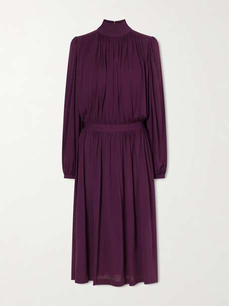 A study in movement and detail, this Gucci dress unfolds through fluid silk crêpe de chine, where structure gives way to softness. The bow at the neckline and GG enameled buttons introduce a sense of quiet ornament, while the pleated skirt carries the silhouette into something more narrative.