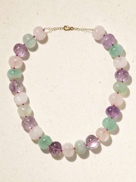 JIA JIA's necklace is strung with pastel quartz beads, each one unique in color and inclusions. It's crafted entirely by hand and has an adjustable gold chain, ensuring it works with any neckline.