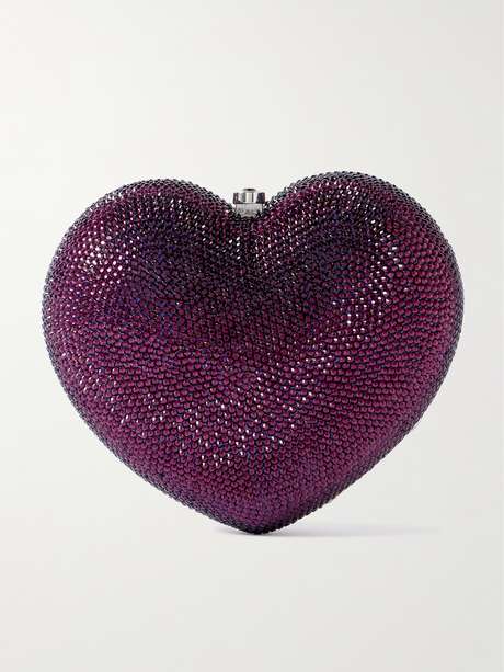 Radiate love and sweet romance with Judith Leiber Couture's 'L'Amour Petit Coeur' clutch. Cast from silver-tone metal in the shape of a heart, it's covered in faceted crystals and comes with a detachable chain strap, so you can carry it hands-free. Stow your lip gloss, keys and hair ties in the compact vegan leather interior.