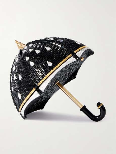 Judith Leiber Couture's 'Umbrella Stormy' clutch is inspired by "rainy days in London". Made from gold-tone metal, it’s adorned with sparkling crystals and has a detachable wrist chain. The metallic lining will fit a coin purse, lipstick and gum stash.