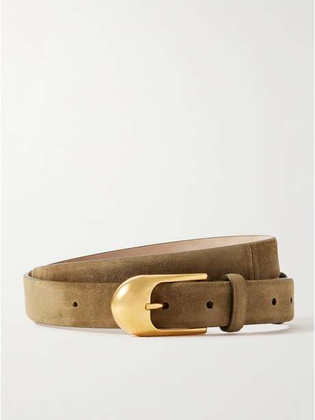 KHAITE's 'Dome' belt was styled with so many looks on the Fall '25 runway, proving its versatility. It's been made in Italy from velvety suede and fastens with a polished gold-tone buckle that you can match your jewelry to.