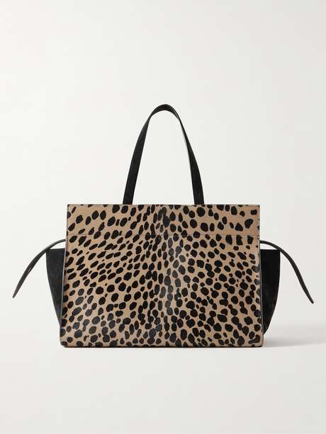 KHAITE reinterprets its signature 'Crosby' tote for Fall '25 in leopard-print calf hair - a motif seen throughout the lineup, which is inspired by David Lynch's '90s film Wild at Heart. Suspended from leather top handles, it has a spacious shape with enough room for a continental wallet, sunglasses and a few cosmetics.