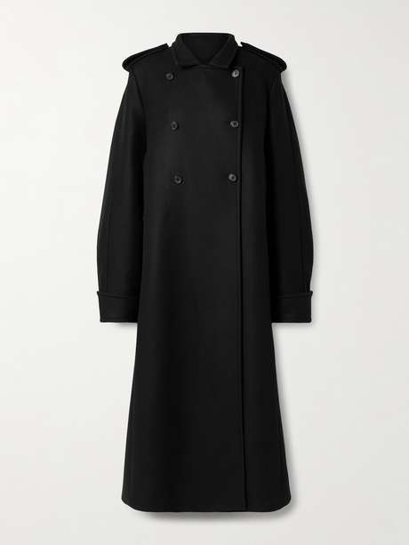 KHAITE's 'Donna' coat is made from insulating wool in an oversized, double-breasted silhouette that falls to an ankle-grazing length. Created for Fall '25, it's has shoulder epaulettes and cuff tabs.