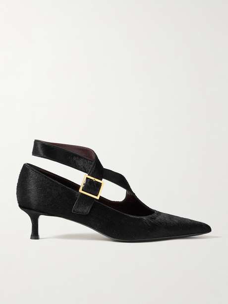 KHAITE's 'Sloan' pumps have a single strap that wraps around your ankle, framing your foot prettily. They're made from tactile calf hair and have sharp pointed toes and 45mm kitten heels.