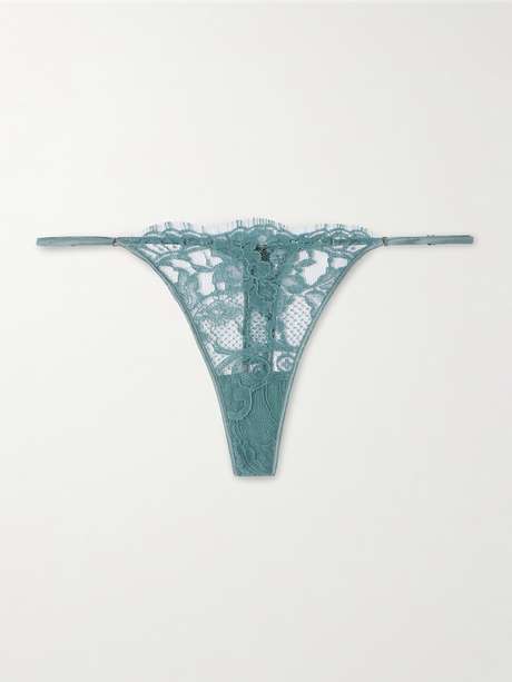 As with the matching bra, Kiki de Montparnasse's 'Camille' thong is made from delicate teal organic cotton-lace trimmed with soft stretch-silk satin. Use the adjustable sides to adjust how high they sit on the hips.