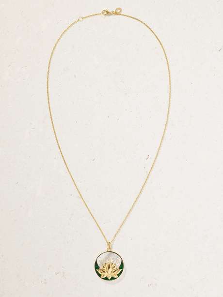 L'Atelier Nawbar's necklace is strung with an intricate 'Lotus Moon' pendant that symbolises tranquillity and new beginnings. Handcrafted from 18-karat gold, it's inlaid with vivid malachite and lustrous mother-of-pearl with 0.05-carats of shimmering diamonds.