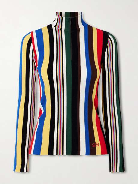 Loewe’s top blends conceptual design with thoughtful construction and pattern. Made from ribbed-knit, it has a close fit, a turtleneck, and a multicolored striped print. Pair it with jeans for casual wear or layer it under a suit for a polished, modern look.