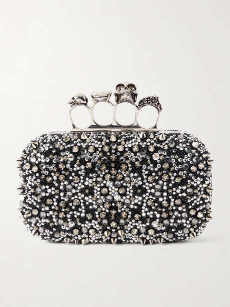 Alexander McQueen's clutch is topped with the label's signature 'Skull Four Ring' embellishment that fans adore. Made from satin and encrusted with crystals and studs, it's designed for a comfortable hold and opens to a lined interior with just enough room for evening essentials.