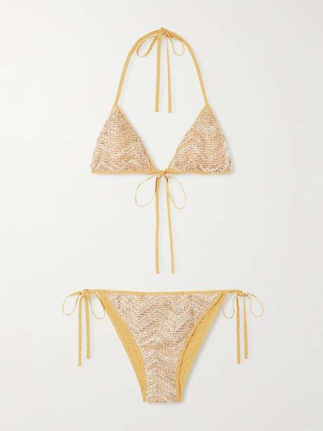 EXCLUSIVE AT NET-A-PORTER. Missoni Mare's metallic crochet-knit bikini is a stellar choice for sun-drenched vacations. It has a triangle top and medium-coverage briefs, both of which adjust with slim ties to secure the shape. The sequins will sparkle gorgeously in the light.