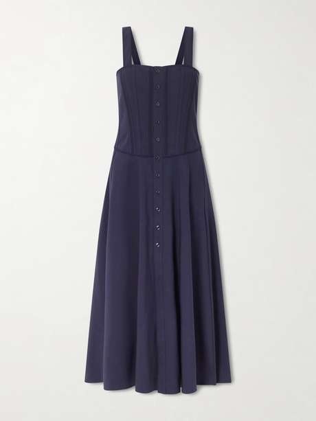 Ralph Lauren Collection's 'Sophee' dress has a pinafore-inspired pintucked bodice that stays true to the season's nautical theme. Tailored from cotton-blend, it's defined by topstitching and has a front slit.