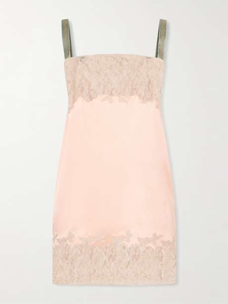 SAINT LAURENT’s mini dress has a distinctly vintage feel, with lace trims at the bust and hem. Made from lustrous silk, it’s suspended from satin straps embroidered with delicate flowers.