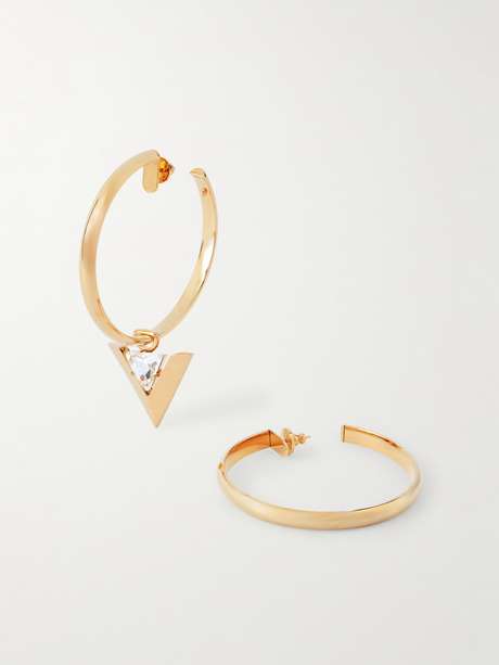 One of Valentino Garavani's hoop earrings is strung with the distinctive 'VLogo' emblem for that mismatched appeal. They're made from polished gold-tone metal and each set with a single light-catching crystal.