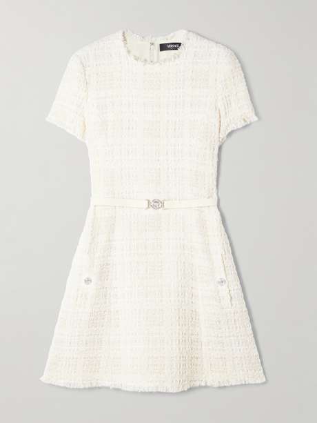 Versace's dress is made from cotton-blend tweed that's flecked with metallic threads for subtle light-reflecting finish. It features the signature 'Medusa' motif on the waist-defining belt and enamel buttons. Frayed trims outline the neckline, short sleeves and floaty hem.