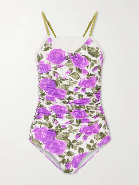 CHLOÉ Bow-detailed ruched lace-trimmed floral-print swimsuit