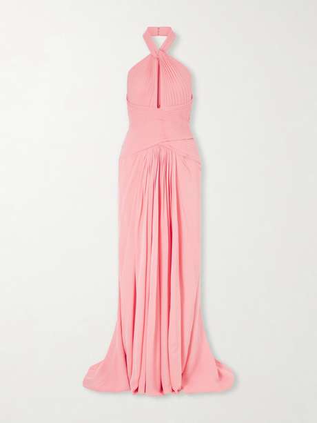 Elie Saab's gown sways beautifully through the artfully pleated silhouette. Crafted from silk-georgette, it falls from a halterneck and is defined by a wrapped waist before falling to a floor-sweeping hem.
