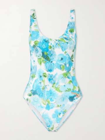 Bow-detailed ruched lace-trimmed floral-print swimsuit