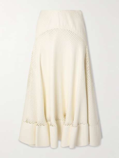Debuted during Alaïa's Summer-Fall '25 show, this skirt honors "the topography of the female form through curves" and fluidity. It's made from supple leather with precision cutouts throughout and has a smooth, softly folded hem that enhances the flowing movement.