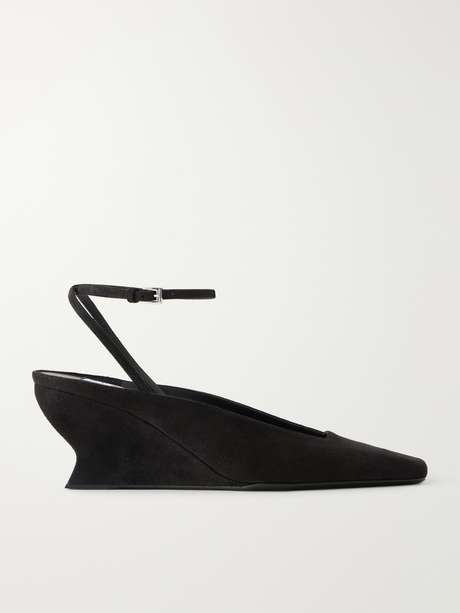 Restraint and expression converge through refined craft in Alaïa Spring ’26. Crafted from suede, these pumps have a modern square-toe silhouette set on sculpted wedge heels. Delicate straps tie at the ankles to frame the foot.