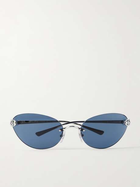 Cartier Eyewear's sunglasses feature the house's iconic panther heads on each temple, symbolizing strength and courage. They've been made in Italy from silver-tone metal with rimless, blue cat-eye lenses.