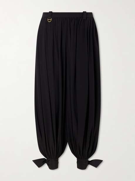 Soft volume defines these pants by Chloé. Crafted from organic silk crêpe de chine, the high-waisted silhouette falls in fluid pleats that create an airy shape. Knotted ties with fabric-covered buttons gather at the ankles, while a gold-tone D-ring lends a subtle signature.