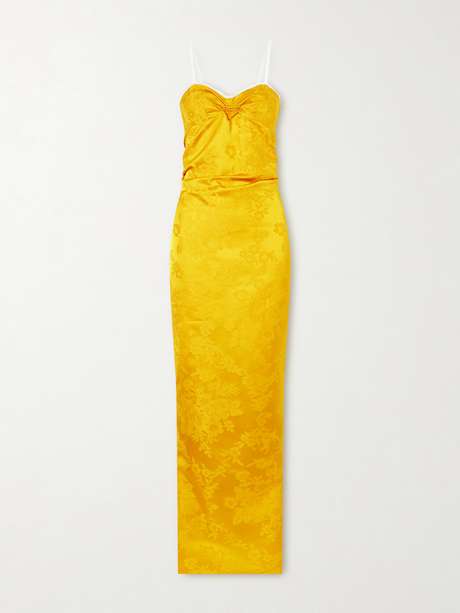 Romantic sensuality defines this 'Silk Jacquard Bralette' dress by Colleen Allen. Woven with a delicate floral jacquard, it’s shaped with a lingerie-inspired bralette bodice that softly contours the form. Slender straps and lace detailing enhance the intimate feel, while the skirt falls in a fluid drape.