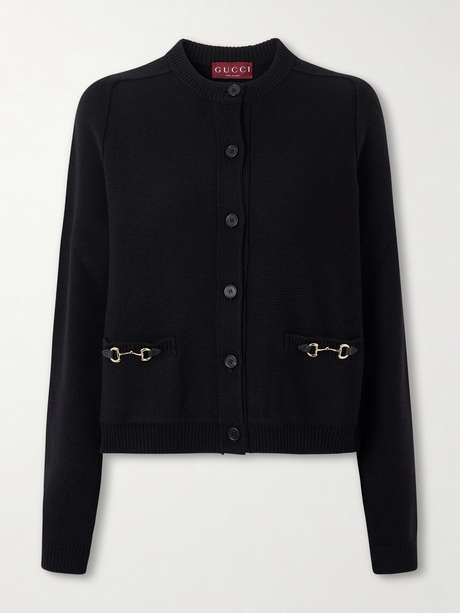 GUCCI Horsebit-embellished leather-trimmed wool and cashmere-blend cardigan