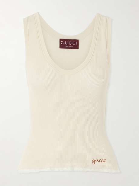 GUCCI Embroidered lace-trimmed ribbed-knit cotton tank top