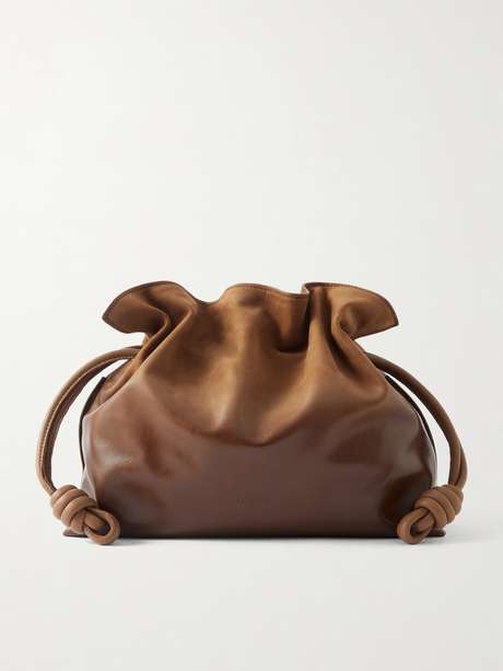 Loewe's 'Flamenco' clutch re-imagines the brand's signature drawstring silhouette in soft nubuck with a dégradé patent finish. It can be carried by hand, worn cross-body or slung over the shoulder and has a roomy interior that easily holds a wallet, sunglasses and a few small essentials.