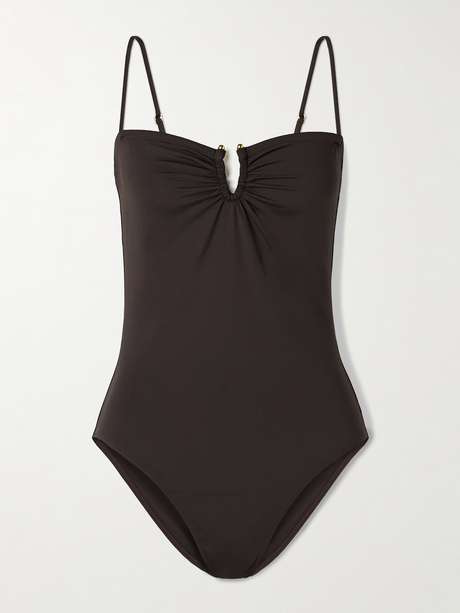 Nili Lotan's understated swimsuit is punctuated with signature gold-tone hardware at the center for a glamorous touch. It has adjustable, detachable straps and offers full coverage.
