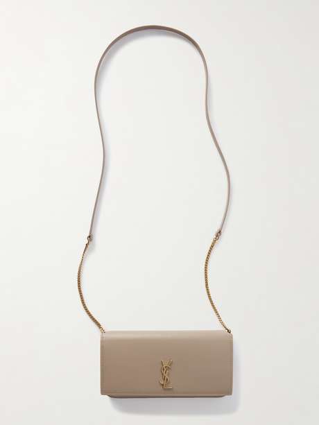 SAINT LAURENT's phone case is a part of the 'Cassandre' collection, a selection of timeless accessories centered around the 'YSL' hardware. It's made from smooth beige leather and has a chain-trimmed strap that matches the iconic gold plaque. There's enough room inside for your phone and a lipstick.