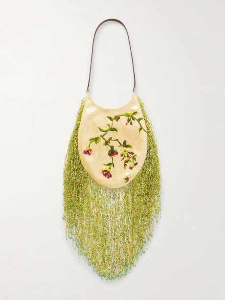 Tory Burch's shoulder bag is such a beautiful piece and a great conversation starter. Made from sequined satin, it's intricately embroidered with beads, forming vines and pink flowers, and edged with long embellished fringing. Stow your lipstick, compact and phone inside.