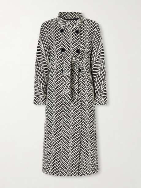 Valentino Garavani's wool-blend coat is reminiscent of ladylike styles from the '60s. Designed with a sleek mock neck, it has a double-breasted profile with ties. The graphic zebra motif commands attention.