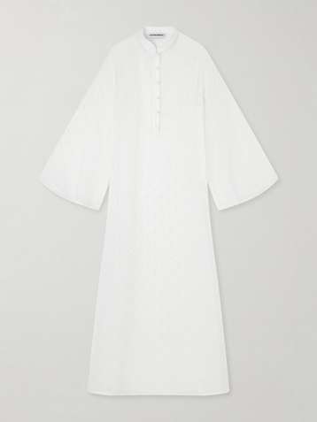 Isabella embroidered silk dupioni-trimmed striped cotton-poplin maxi dress
