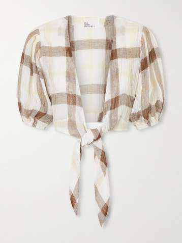 + NET SUSTAIN Pouf cropped tie-front checked linen-blend gauze top