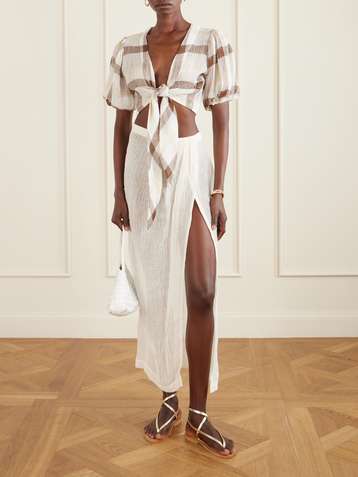 Cropped tie-front linen-blend gauze top